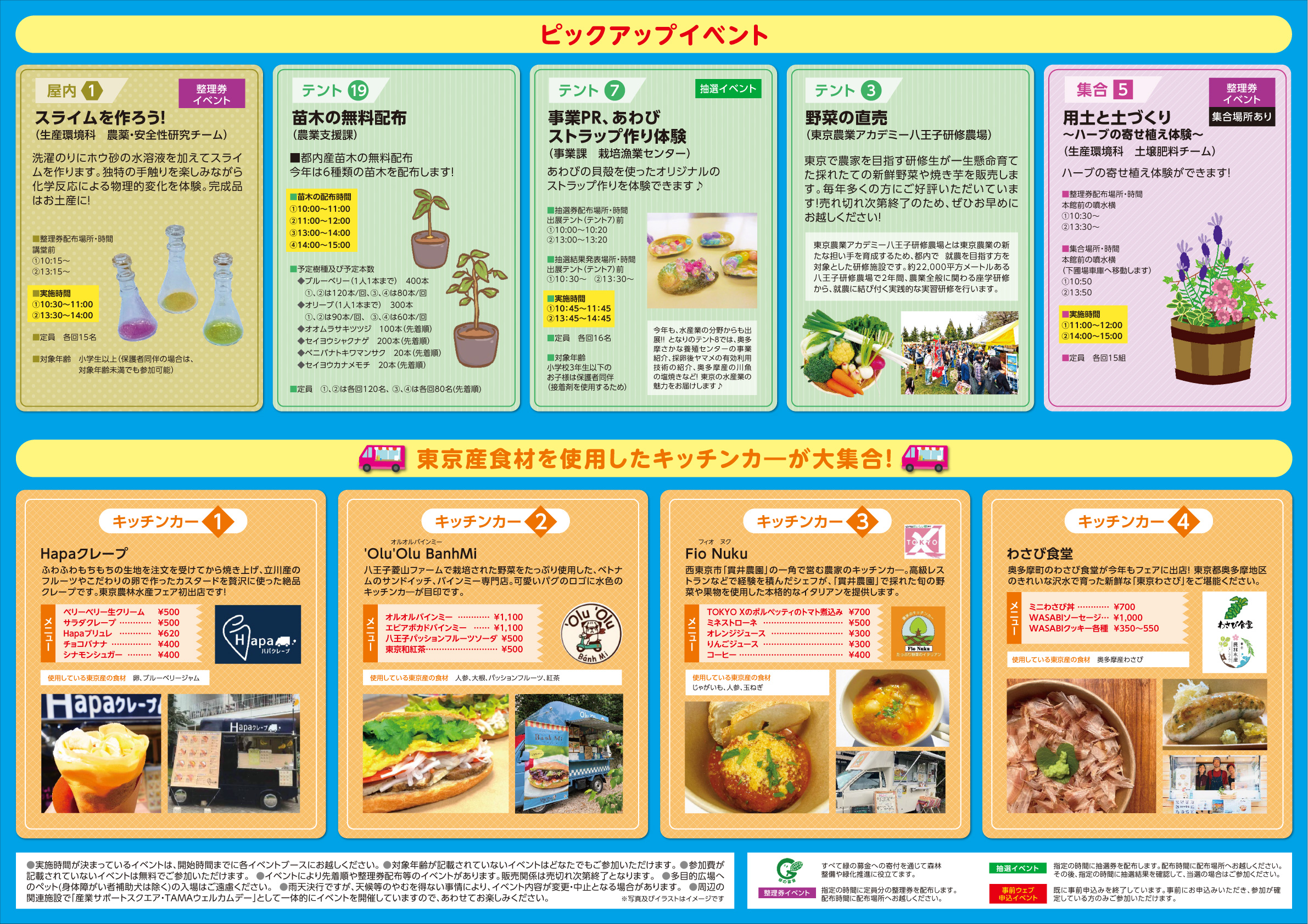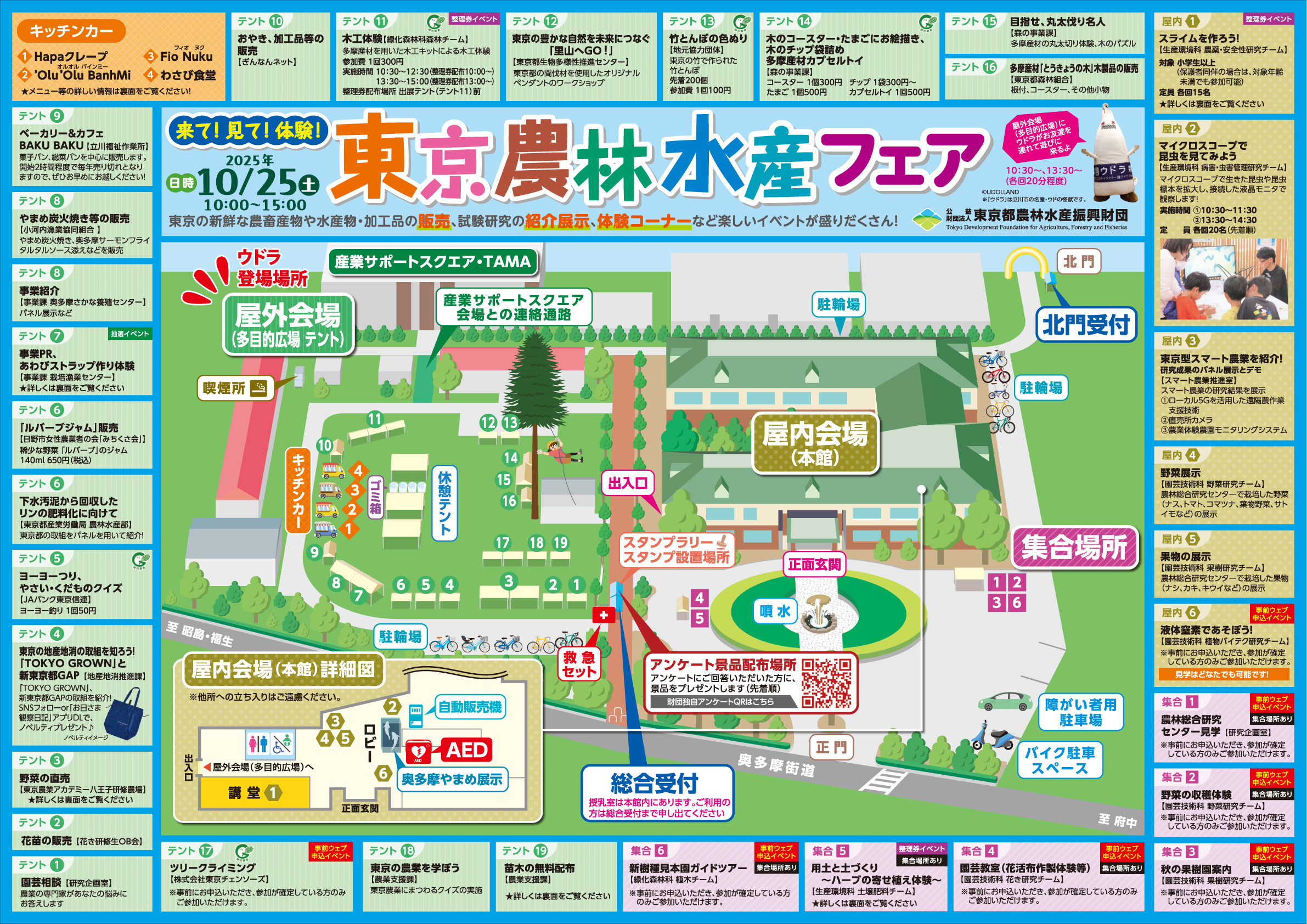 会場では都内農家が生産した新鮮な農畜産物や加工品の販売、試験研究の紹介展示のほか、子どもから大人まで楽しめる体験コーナーが充実。