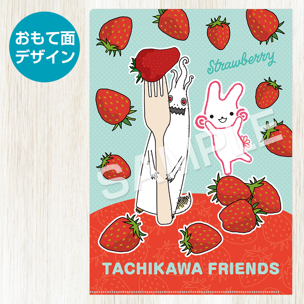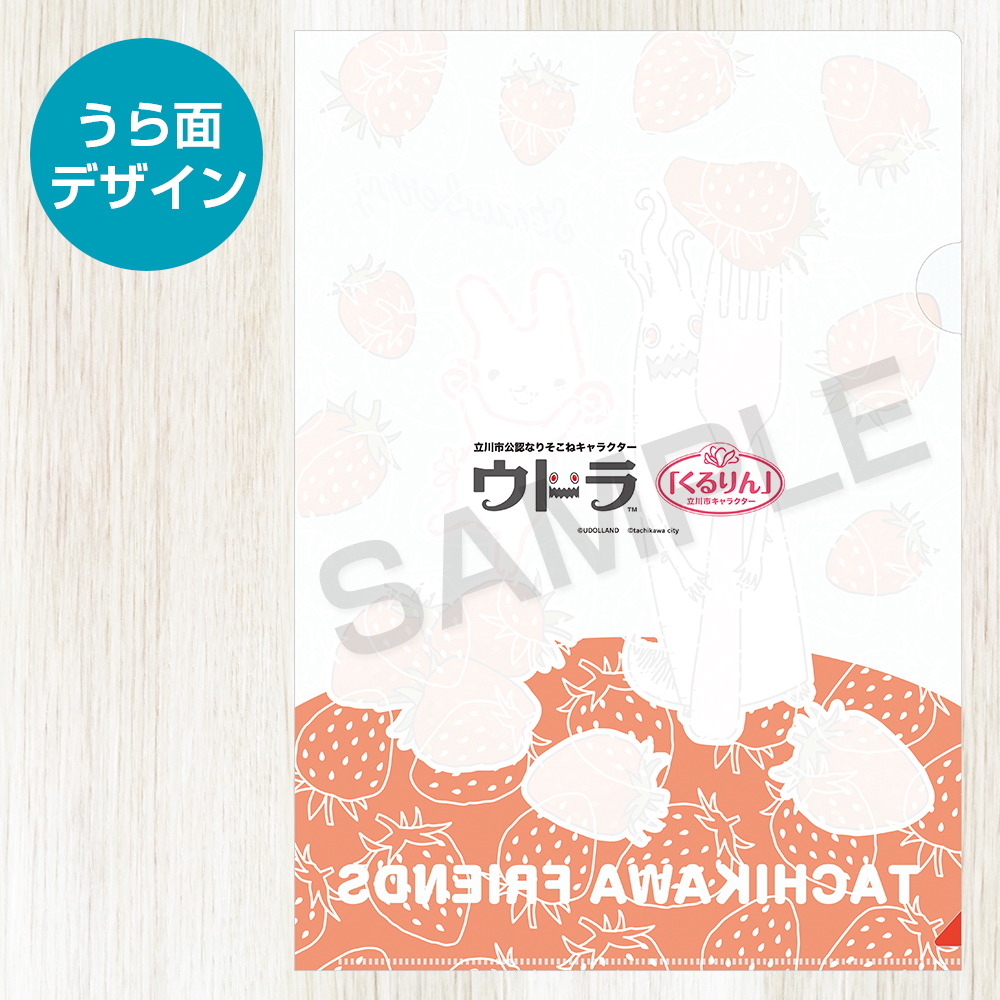 おもて面は立川の推し果物「イチゴ」に囲まれたウドラとくるりん、うら面は白を基調としたイチゴの総柄がデザインされた可愛らしい一品です。