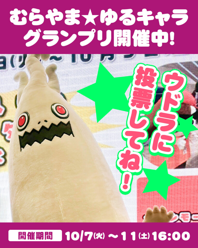①イオンモールのアプリをダウンロードして「むさし村山」をお気に入りに登録 ②キャンペーンページからゆるキャラまつりをクリック ③ウドラに投票! 【投票期間】10月7(火)〜11日(土)16時まで 【結果発表】11日(土) 16時〜