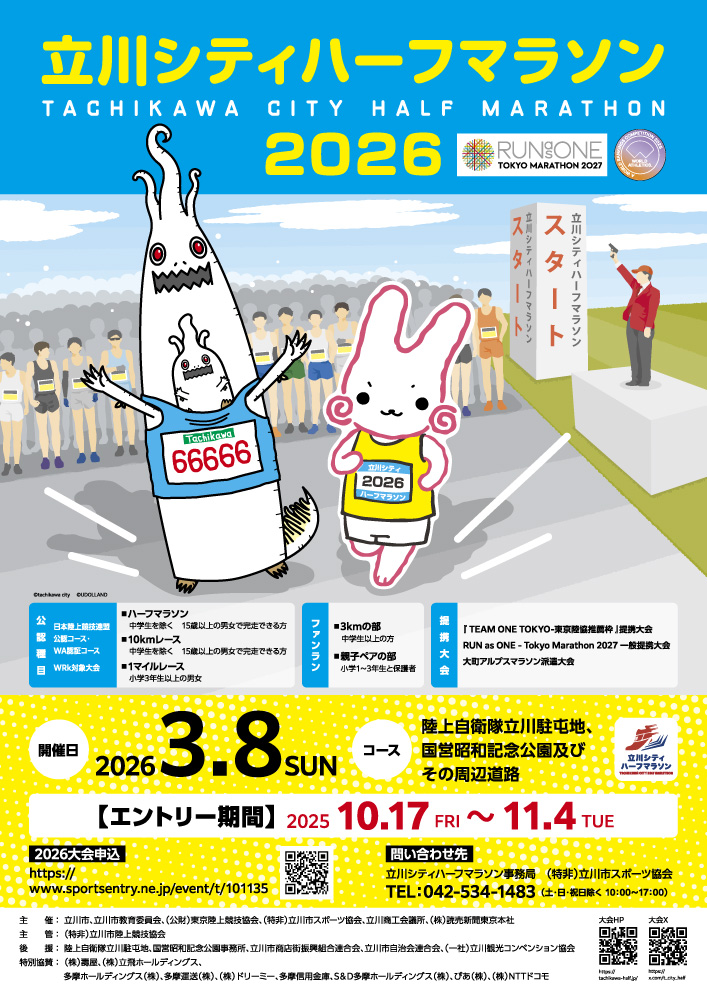 来年3月8日開催「立川シティハーフマラソン2026」のエントリーが開始されました。