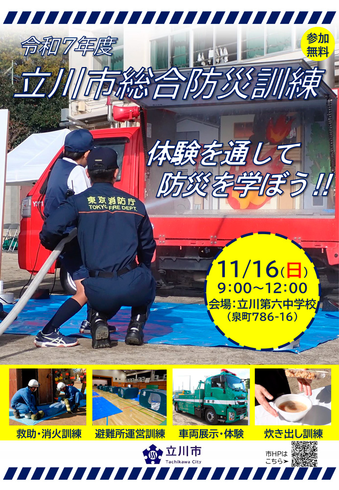 立川市立立川第六中学校で『立川市総合防災訓練』が開催されます。 ウドラはくるりん、たっちー、アスレくん、キュータ、ピーポくんと一緒に会場に登場。 登場時間など詳しい情報はイベントページをご覧ください。